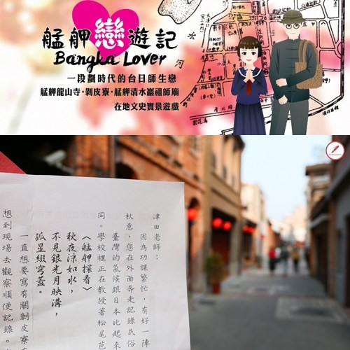 打開《艋舺戀遊記》的遊戲包,除了一張背景故事說明外,還有一份遊戲說明,以及四封信件,分別印上不同的地點,都位在萬華市區,猶如艋舺旅遊遊戲包。信內則有著黃芝鑾寫給老師的信,並在信中埋藏不少謎題。