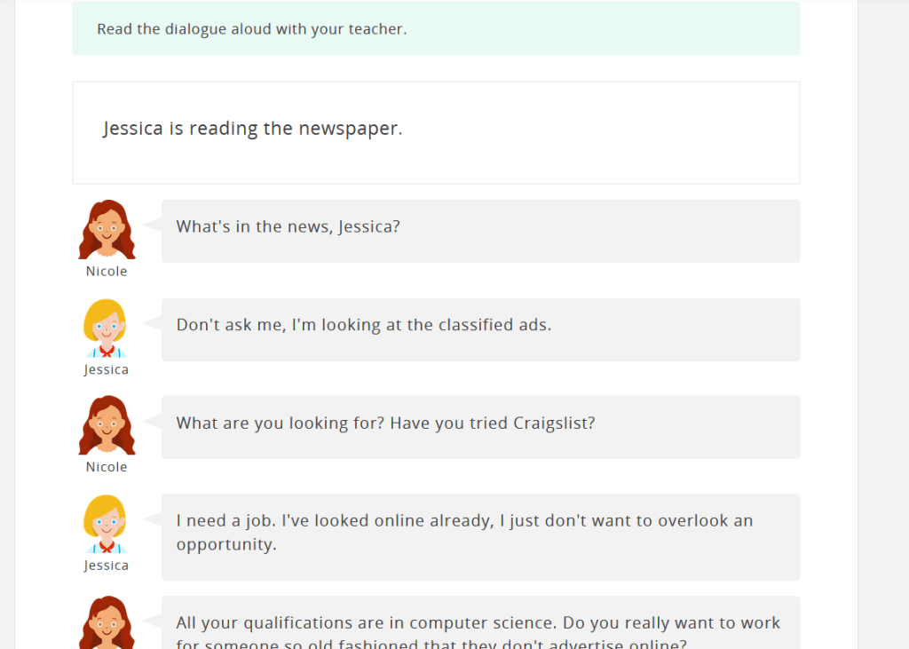會話是訓練口說的好教材,內容分成字彙、對話練習、角色扮演以及討論,我覺得想練口說的,都應該要選擇這個分類的教材,讓老師和你練習對話。