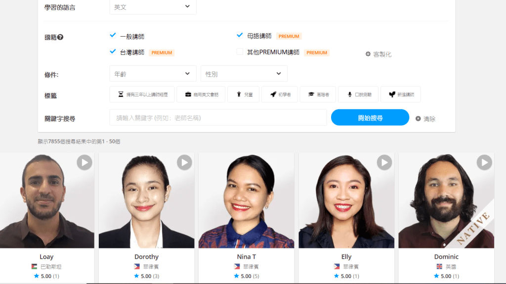 這些老師的條件還可以分類篩選,像是國籍,若持有Premium會員,則能夠向最道地的母語人士學習,若一開始覺得要跟外國人開口有挑戰,也可以選擇台灣老師。