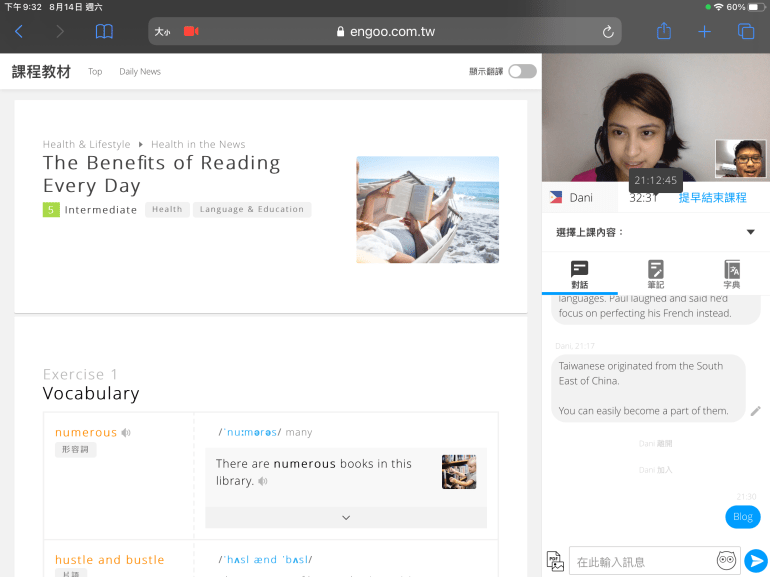 每日新聞真的是每日不斷更新的,內容從時政到健康生活應有盡有。而課程可以分成字彙、文章、問題、討論、進階討論五部分;其中前三部分是自己讀就可以的。但搭配老師教學,第四、五部分更能讓你有互動性,並從中激盪出許多的新知識。