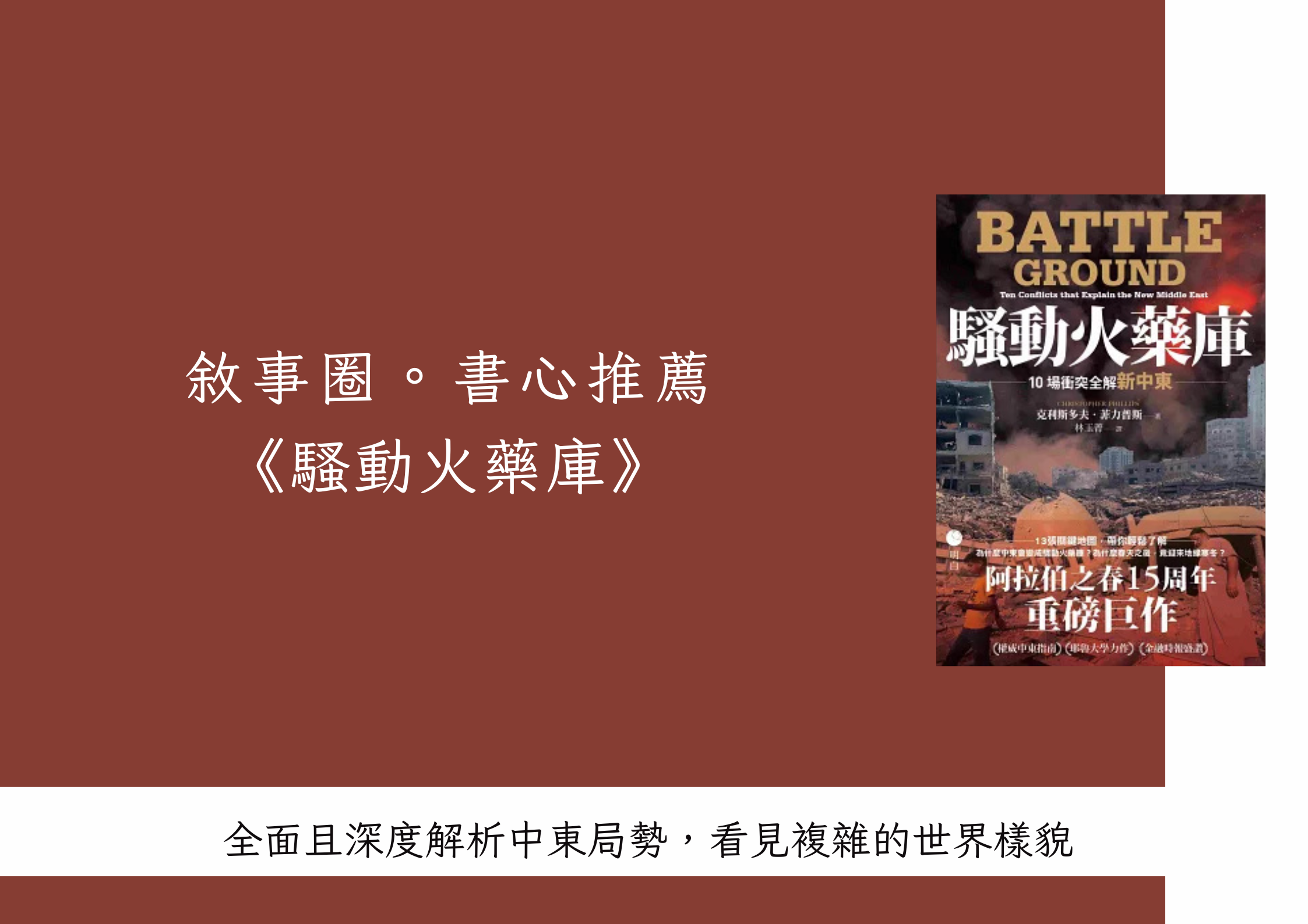 明白文化年初推出新書《騷動火藥庫》,由被稱為「西方中東通」的權威學者克里斯多夫.菲力普斯(Christopher Phillips)所著,十場關鍵衝突和十三張簡潔地圖,捨棄「美國是世界秩序維護者」的觀點,改以上帝視角俯瞰如今「新中東」的樣貌。