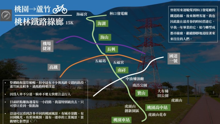 我一直想著有一天,能夠騎過那條曾是鐵道的綠廊,一路到達海邊,就像當初火車從桃園市區開往林口濱海一樣。